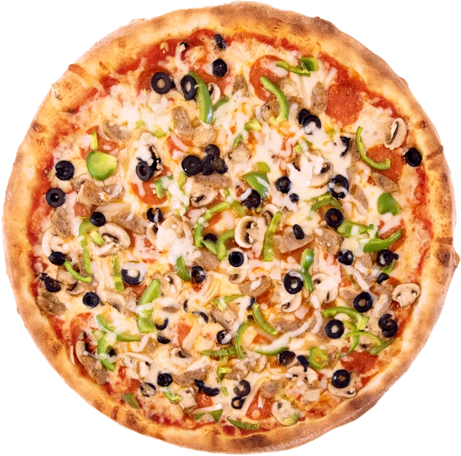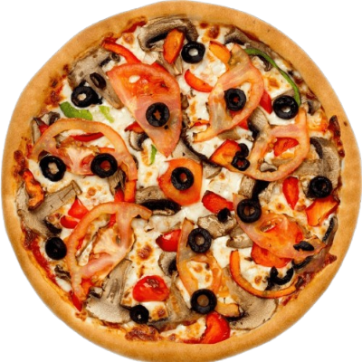 Crispy crust topped with colorful bell peppers, mushrooms, onions, and black olives.